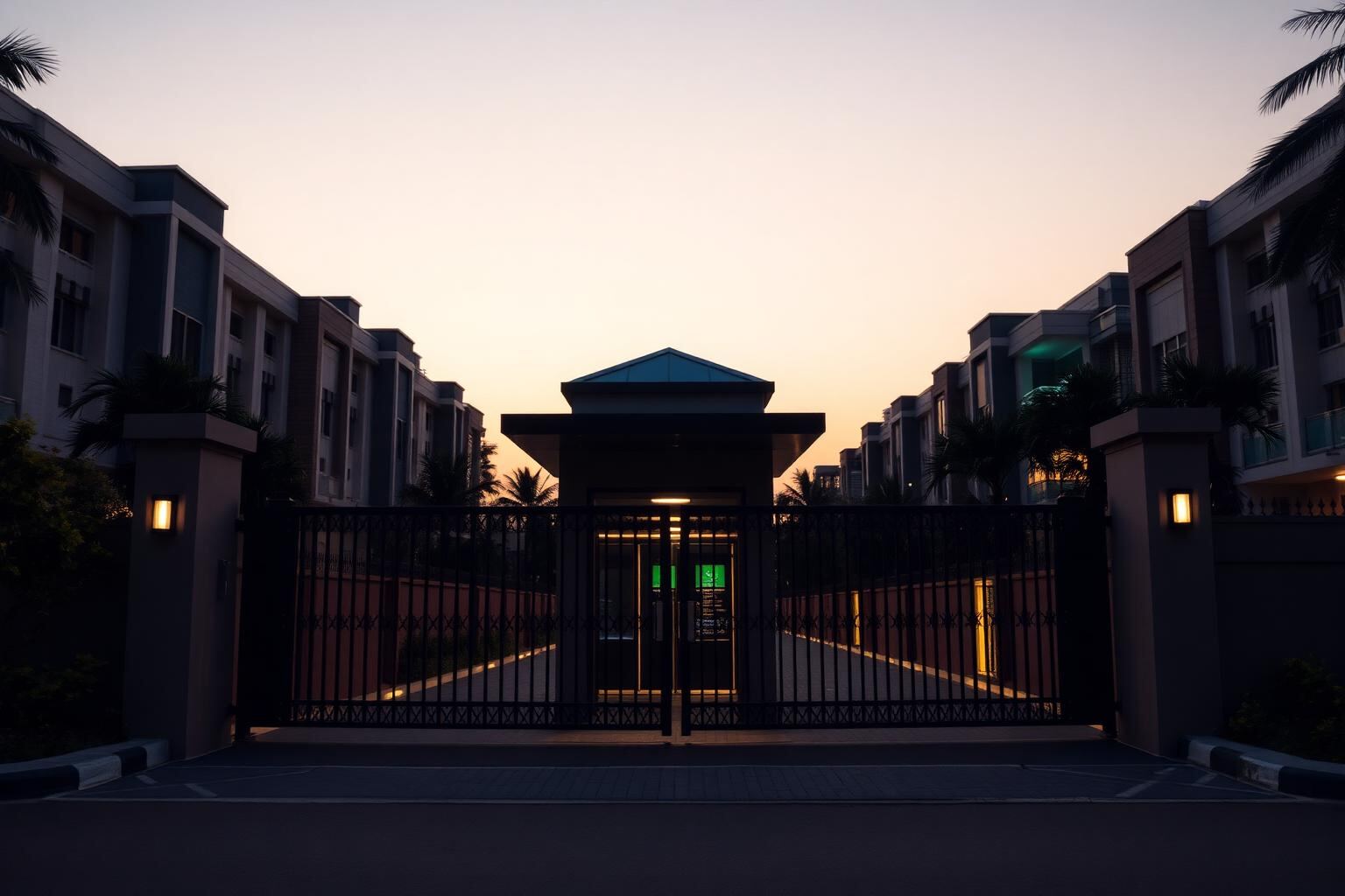 Premium residential community main gate with security cabin and boom barrier at dusk